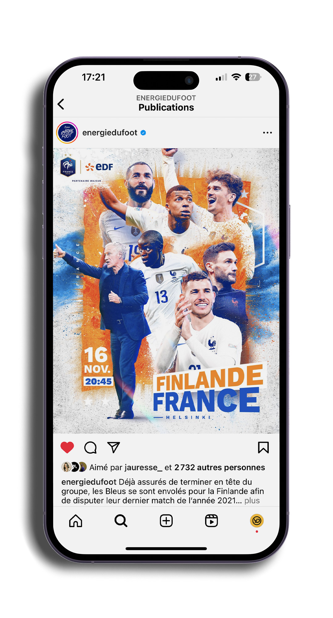 En amont de la compétition, j’ai également réalisé un visuel “J-100” pour susciter l’engouement des abonnés. Lorsque l’aventure s’est terminée, le compte “Énergie du Foot” a tenu à partager son soutien à l’équipe et a partagé un visuel “Merci les Bleus”, créé par mes soins, après le dernier match.